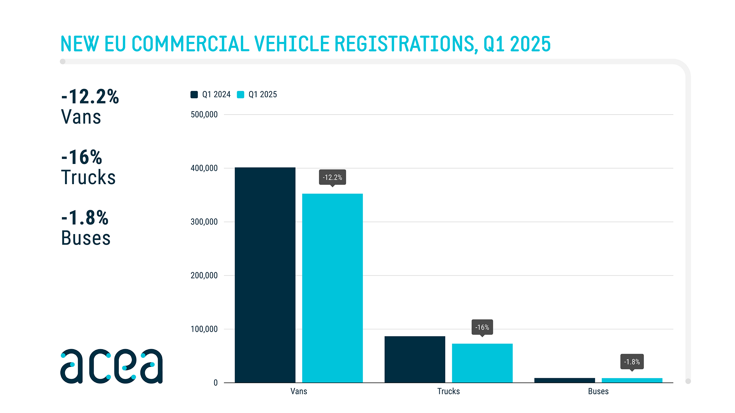 New commercial vehicle registrations: vans -12.2%, trucks -16%, buses -1.8% in Q1 2025