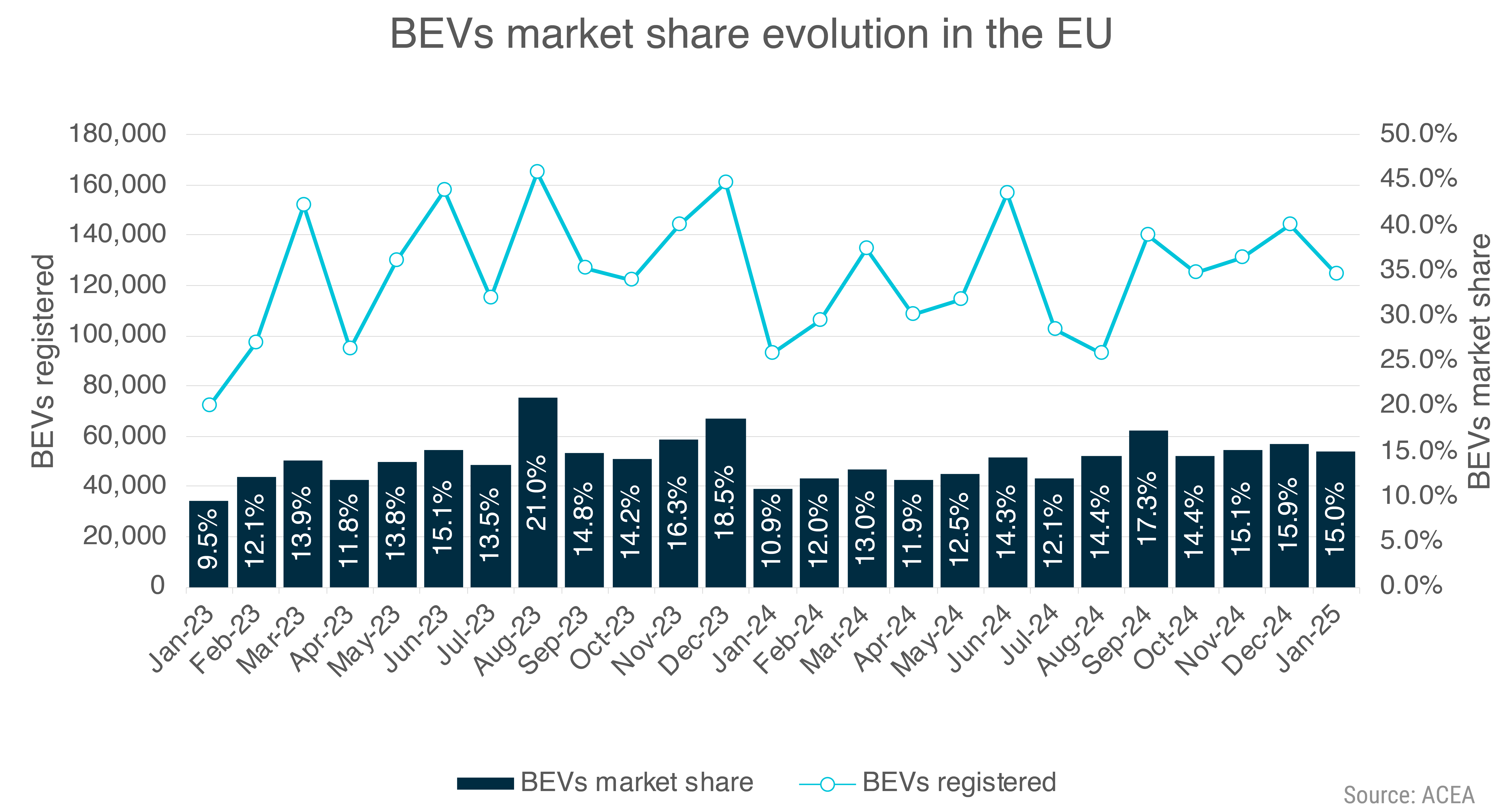 There are also 370 BEV models available on the EU market now, including 16 models that are priced less than 30,000 EUR. Vast selection of low mileage used vehicles is available with discounts of 30-50% compared to new vehicle prices but there is still limited demand for this segment as well. Despite the offer, the market share for BEVs in 2024 was below 14%. Even if we look at the previous years, we can see that demand over 2023-2024 remained stable, with no ‘hockey stick’ growth curve that was expected. In fact, the market share for BEVs over the past years has remained largely stable and failed to reach the 25-30% market share forecasted several years ago.