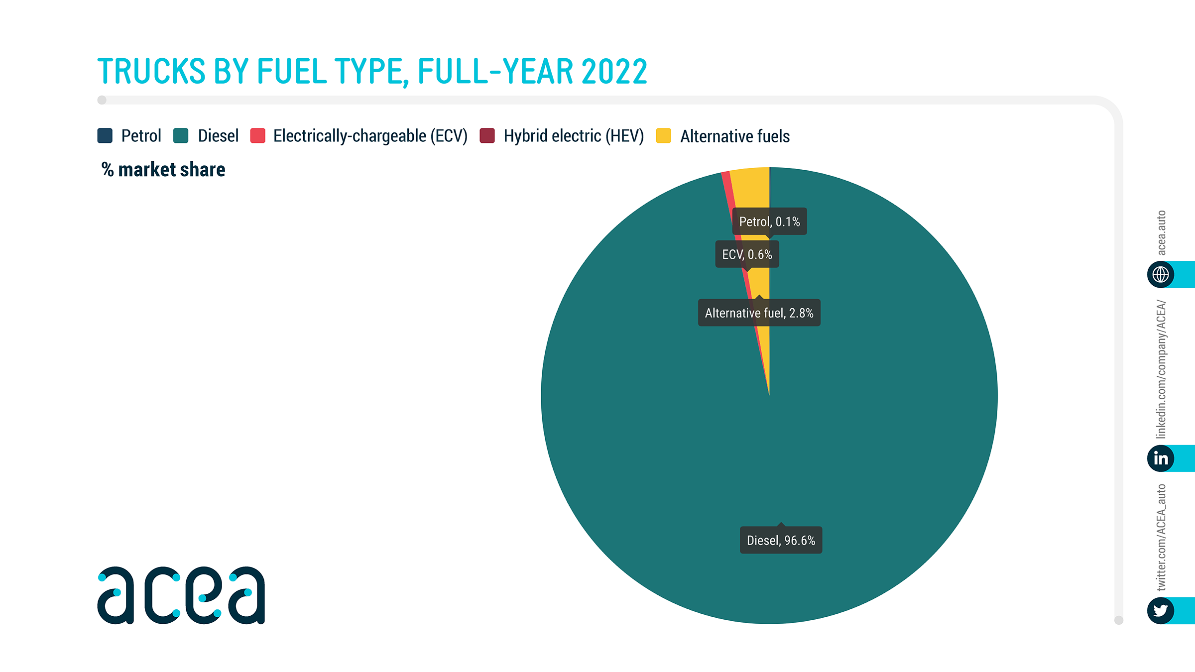 Fuel types of new trucks: electric 0.6%, diesel 96.6% market share full-year 2022