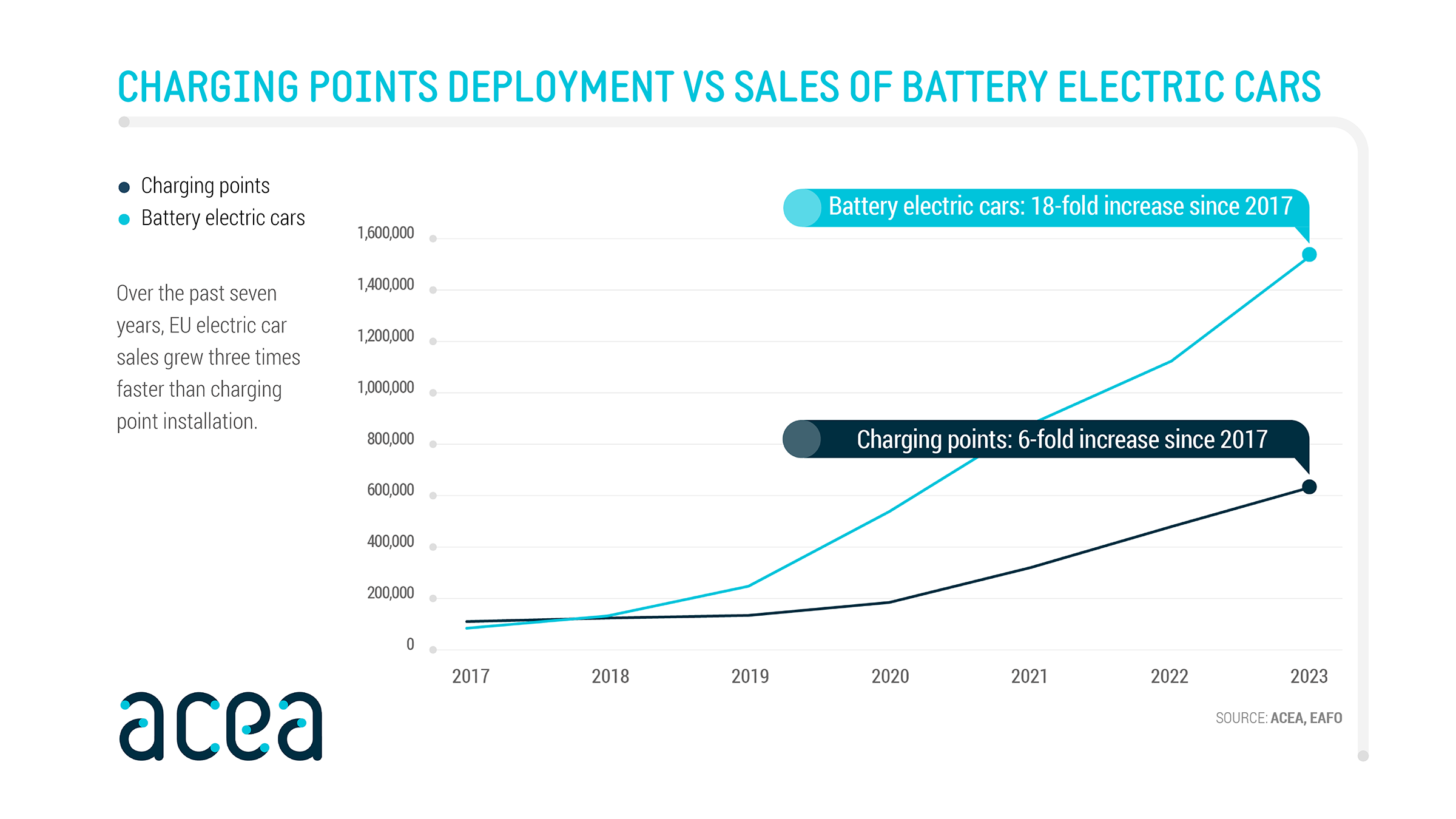 EU electric car sales grew three times faster than charging point installation between 2017 and 2023, ACEA’s report shows. Looking ahead, the EU needs eight times more charging points annually by 2030.