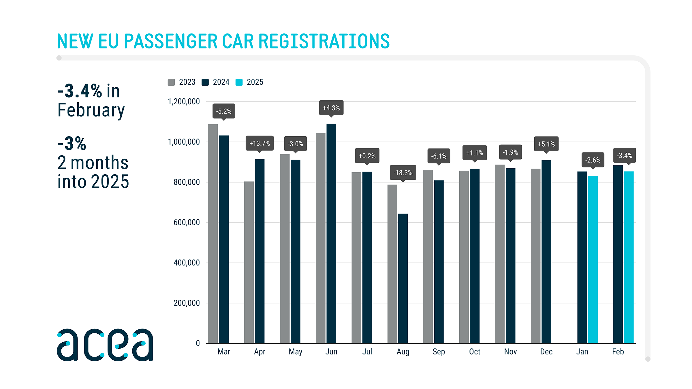 In February 2025, the year-on-year (YOY) decline was 3.4%, with the German market seeing the sharpest decline in volume of 6.4%, followed by Italy (-6.2%).