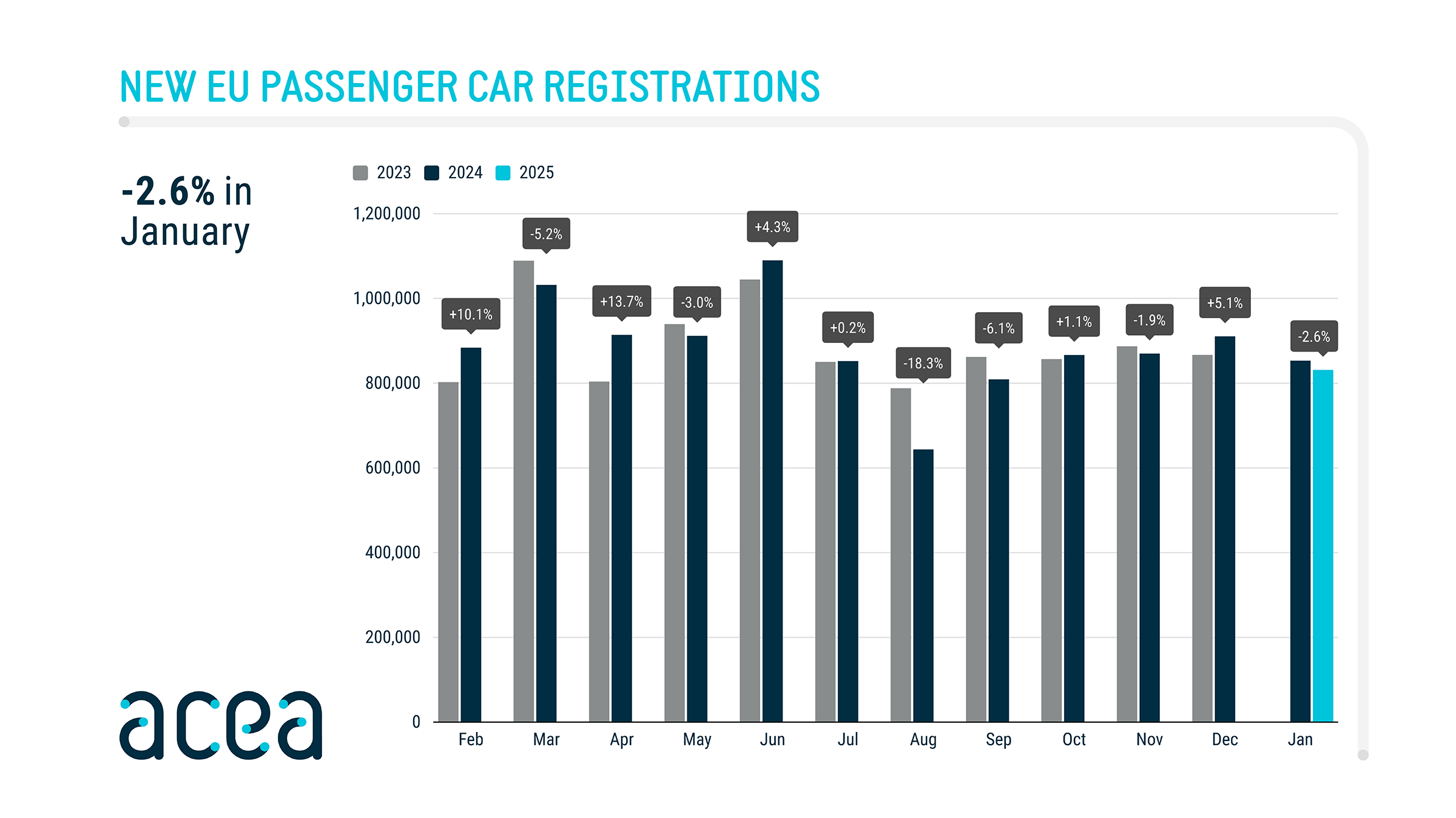New car registrations: -2.6% in January 2025; battery-electric 15% market share