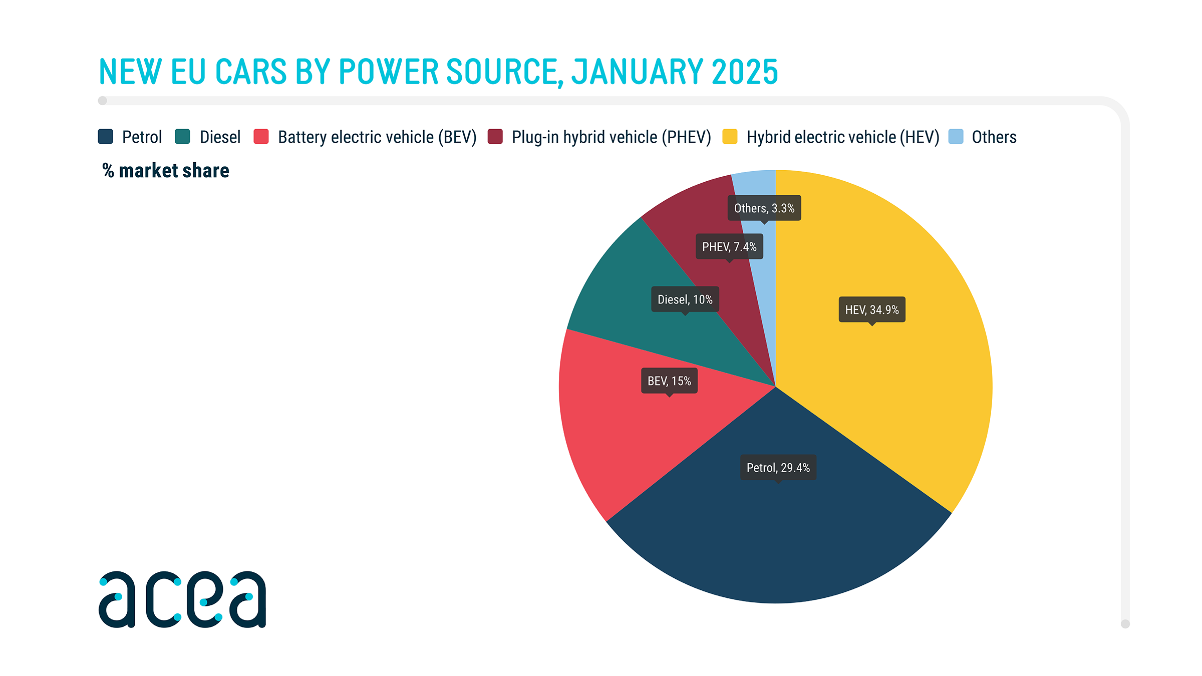 In January, battery electric vehicles (BEVs) made up 15% of the market share, up from the low baseline of comparison of 10.9% in January 2024. Hybrid-electric vehicles surged ahead, commanding nearly 34.9% of the market and becoming again the first most preferred choice among EU car buyers. Meanwhile, the combined market share of petrol and diesel cars fell to 39.4% in January 2025, down from 48.7% one year ago.