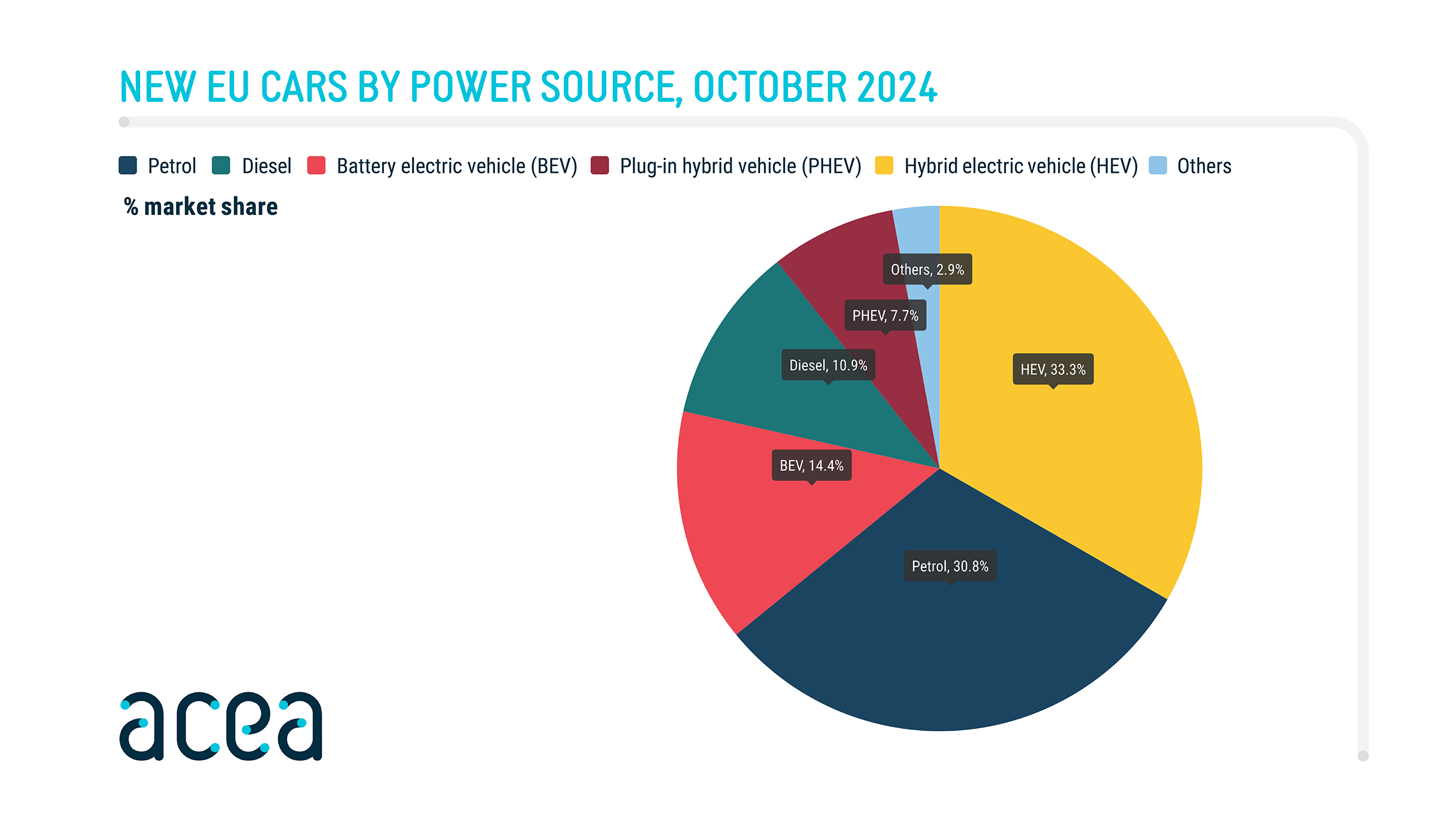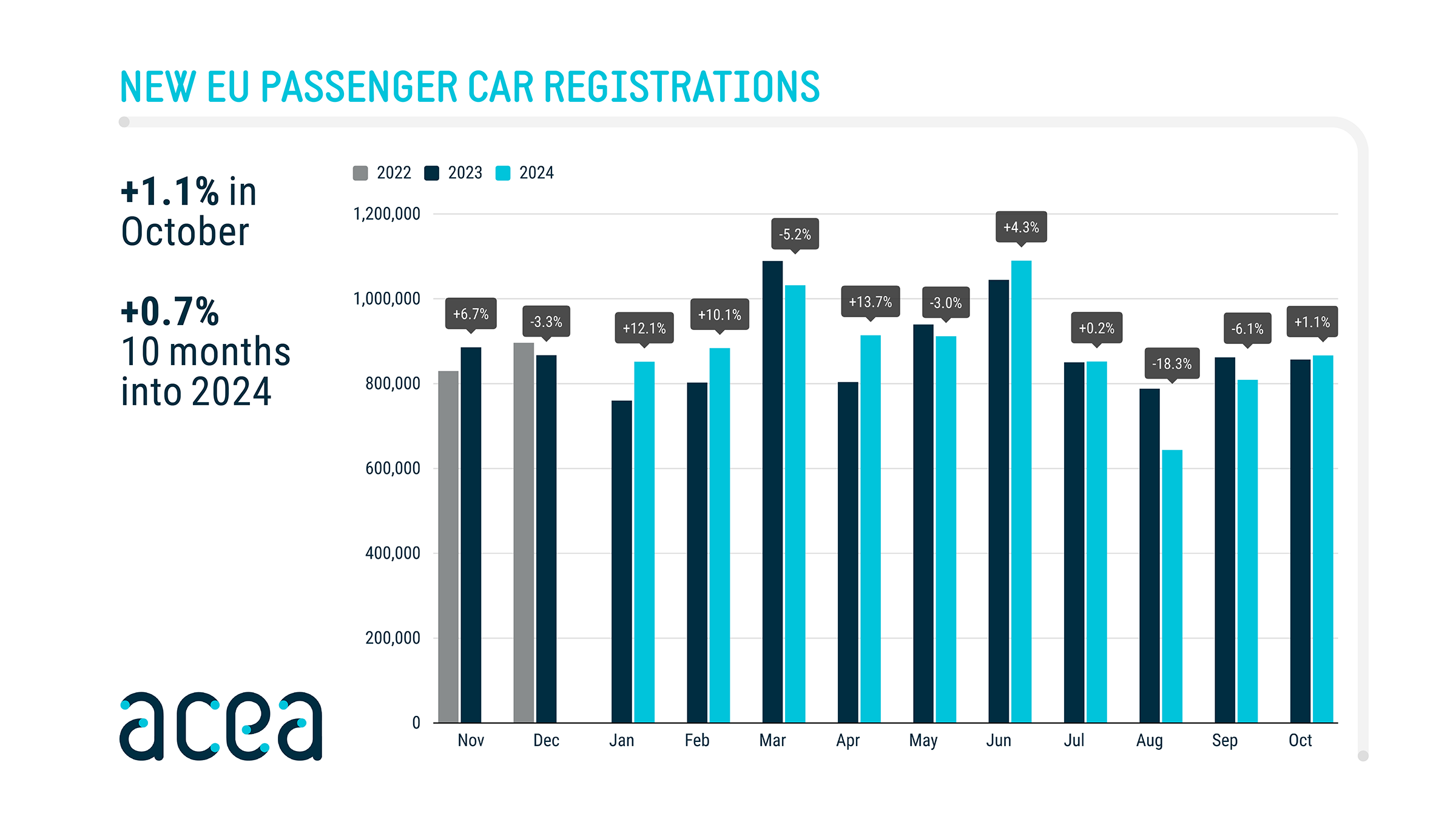 New car registrations: +1.1% in October 2024; year-to-date battery-electric sales -4.9%
