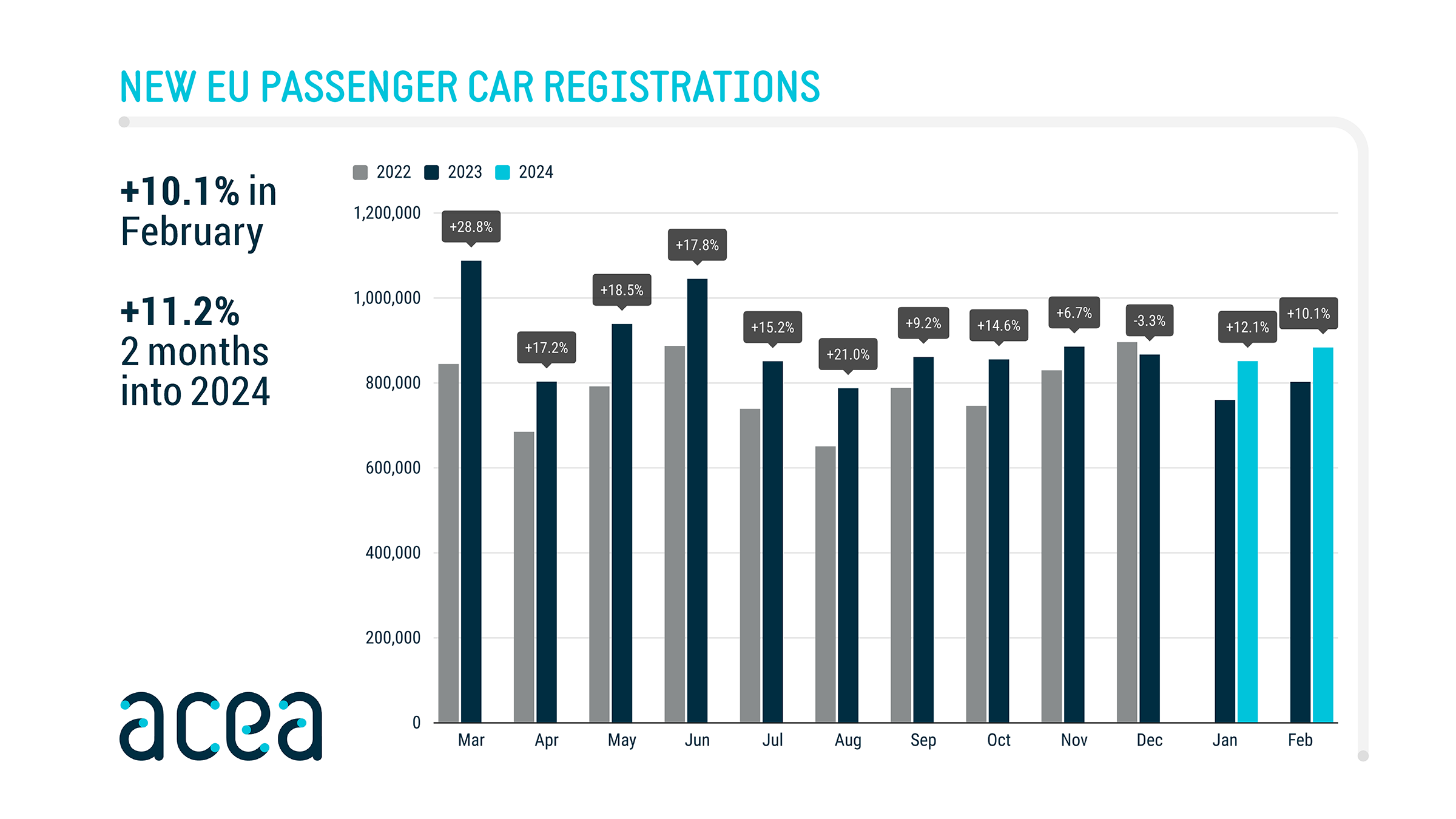 New car registrations: +10.1% in February 2024; battery electric 12% market share
