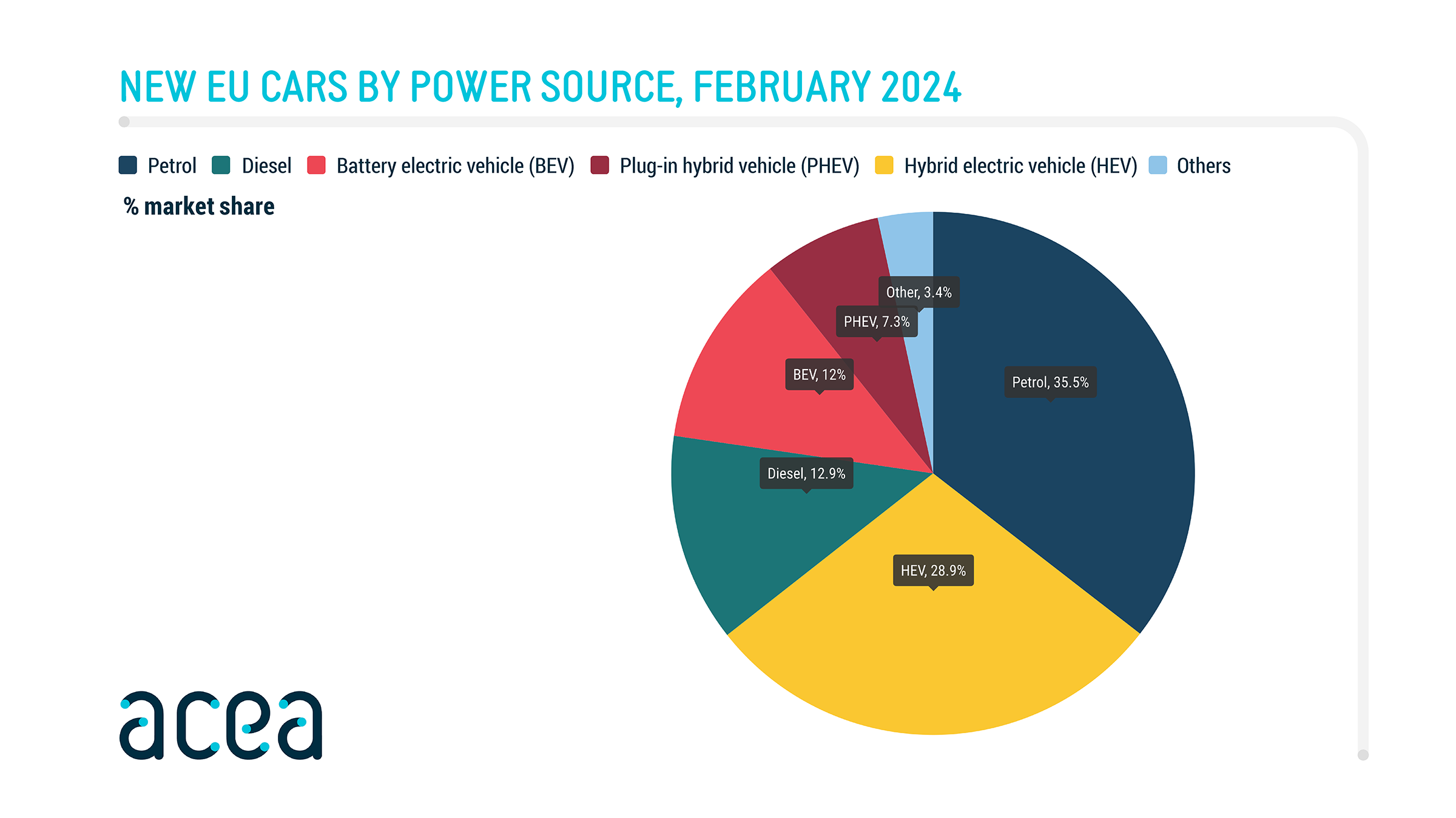 In February, battery-electric cars held a market share of 12% (stable compared to February 2023), while hybrid-electric cars captured nearly 29%. The combined market share of petrol and diesel cars was 48.4% in February 2024, a decrease from 51.9% last year.